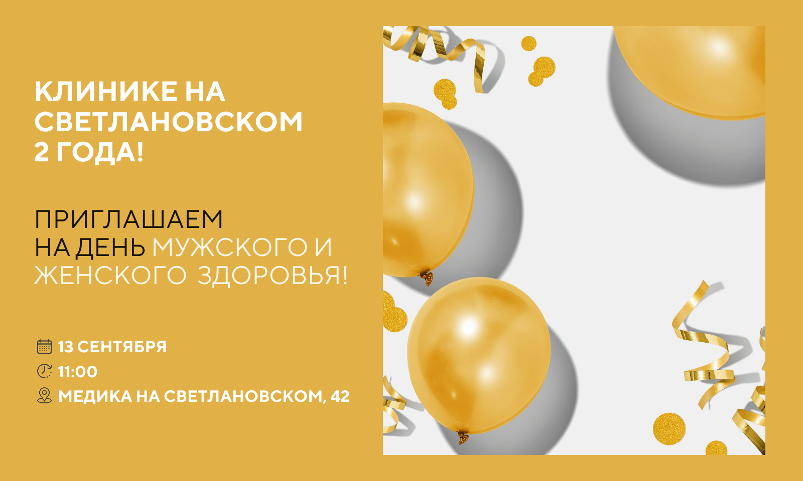 13 сентября приглашаем вас отметить наш второй день рождения! В честь этой даты клиника “МЕДИКА” на Светлановском проводит День Мужского и Женского Здоровья – событие, посвященное профилактике, ранней диагностике и поддержанию жизненной энергии. Это уникальная возможность получить экспертные знания от наших ведущих специалистов, задать интересующие вопросы и позаботиться о своем благополучии.